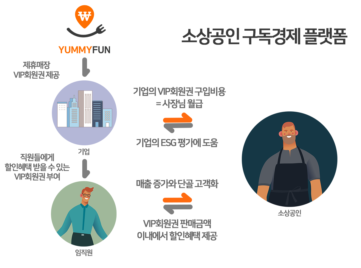 지역 소상공인들은 각종 할인과 혜택이 접목된 VIP 회원권(쿠폰)을 발행하고, 소비자들이 이 VIP 회원권을 구입함으로서 단골을 확보하게 되고, 소비자들은 가격에 대한 혜택, 특별함을 누릴 수 있는 혜택을 제공받음으로서 서로가 만족할 수 있는 경제 논리를 구축한 ㈜야미펀은 소상공인 구독경제 플랫폼 개념을 적립해나가고 있다.