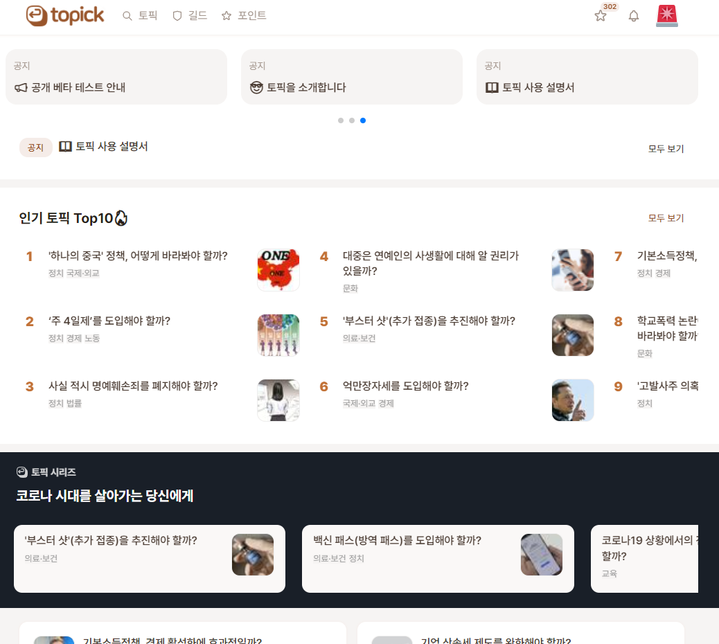 토픽은 ‘사회적인 논의가 필요한 안건’에 대해 여러 시민들과 미디어가 소통하며 의견을 공유할 수 있는 온라인 플랫폼입니다. 현재는 운영 중인 서포터즈 단체를 통해 다룰 안건을 결정하고 토픽 리포트를 제작해 업로드하고 있습니다. 이러한 지식 콘텐츠와 의견 제시 시스템을 바탕으로 사용자들이 사회 현안을 이해할 수 있도록 함은 물론, 온라인 플랫폼을 통해 본인의 생각을 좀 더 편하게 제시할 수 있는 논의 공간을 제공하고 있습니다. 더불어 사람들이 조금 더 쉽게 사회 현안을 다룰 수 있도록 유튜브 채널을 함께 운영하고 있고, 고등학생을 대상으로 토론 방법론 설계 교육 프로그램도 운영하며 대중들에게 친근하게 다가가기 위해 노력하고 도전하고 있습니다”