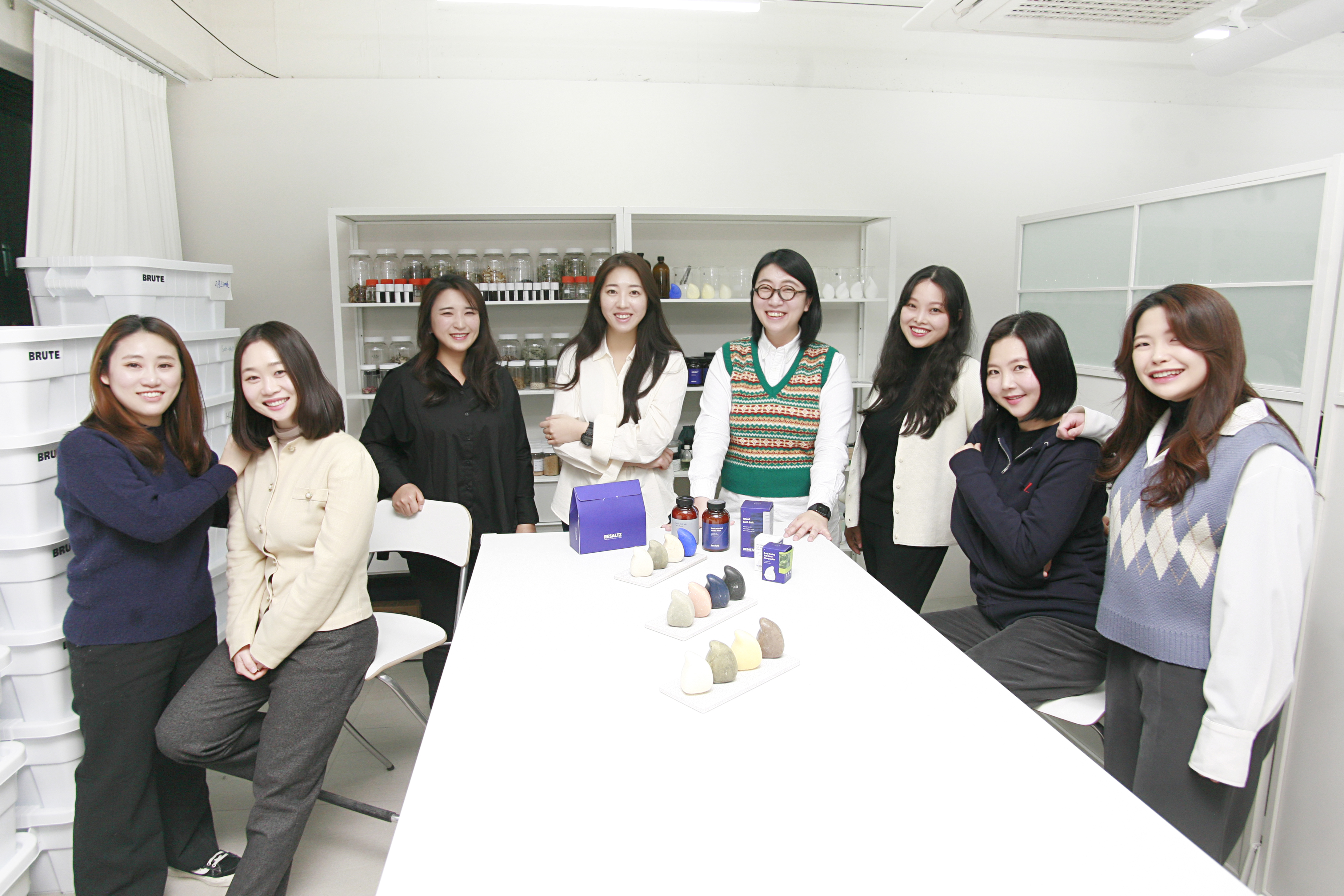 국내와 해외시장을 겨냥한 K-웰니스 콘셉트의 뷰티 브랜드인 ‘리솔츠(Resaltz)’를 선보인 ㈜히즈(Hiz) 팀. (좌측부터 임주현 PD, 류수현 BM, 김설 팀장, 임애라 팀장, 권윤정 대표, 윤린다 연구원, 예수경 책임연구원, 장채연 PD)