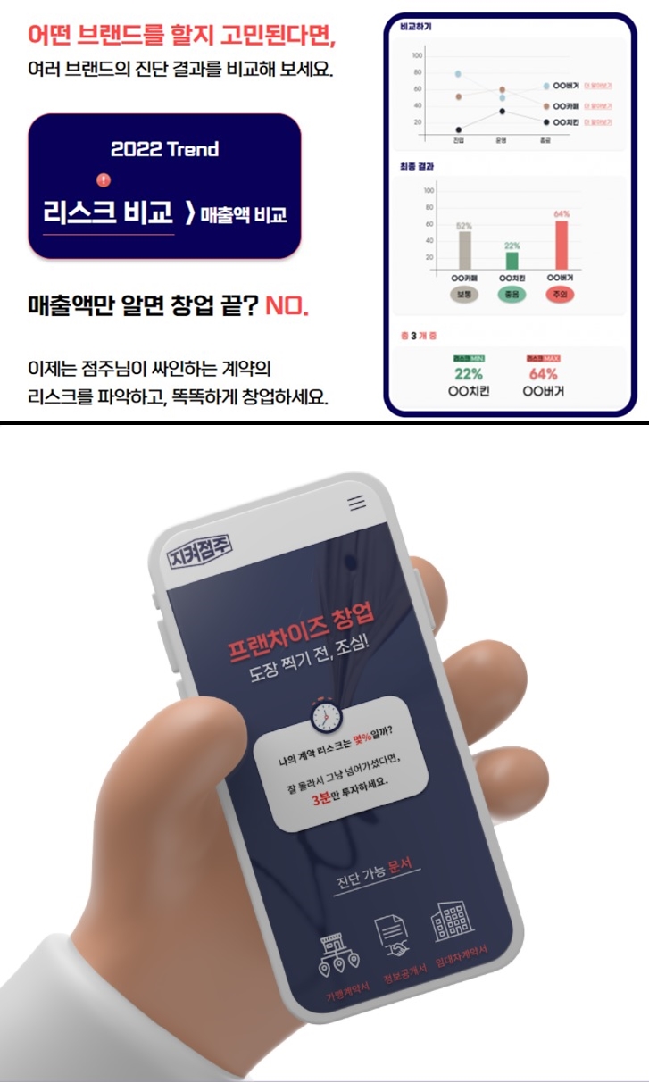 “법적 지식이 부족한 소상공인을 대상으로 계약 체결 전 계약 문서에 있는 키워드와 비용, 독소 조항을 기반으로 해당 계약의 안전도를 ‘%’로 표시해 진단해주는 ‘지켜점주’ 서비스를 제공하고 있다. 프랜차이즈 시장의 주요 플레이어는 가맹거래사와 프랜차이즈 컨설팅사, 상권분석 플랫폼을 꼽을 수 있다. 이 중 대부분은 가맹본부 또는 가맹브랜드 창업자로부터 수수료를 받아 매출을 내는 구조이다. 이로 인해 예비 점주들은 이들에게 ‘창업하세요’라는 말을 주로 듣게 될 뿐 창업에 있어 어떤 리스크가 있는지는 객관적으로 분석하기가 어렵다. 지켜점주는 계약서의 ‘안전점수’를 산정함으로써 누구나 쉽게 이해할 수 있을 뿐만 아니라, 여러 업체의 계약 문서 점수를 쉽게 비교해 점주들이 효율적으로 계획을 수립하고 의사결정 할 수 있게 도움을 주려고 한다”