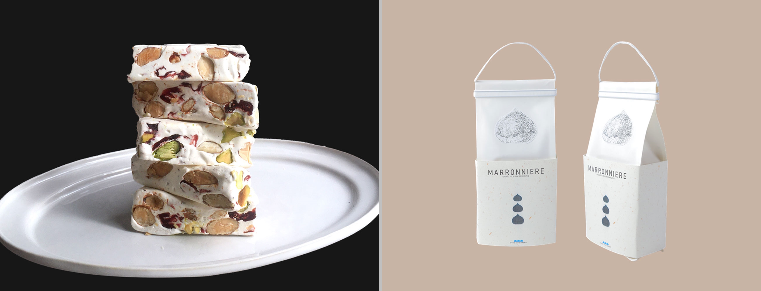 견과류와 섞어 만들어 쫀득하고 달달한 맛을 내는 프랑스의 과자 종류인 ‘누가’는 어떤 꿀을 사용하는지가 무척이나 중요하다. 보통 한국에서는 아카시아 꿀이 많이 사용되는데, 김미경 대표는 밤 꿀을 활용함으로써 익숙함 대신 개성 있고 독특한 맛을 고급스럽게 표현하고자 했다. 강한 향에 대한 ‘호불호’는 제주 유채 꿀과 함께 블렌딩하는 것으로 해결했다. 밤 꿀을 벌집 채로 유채 꿀에 재워 쓴맛 대신 좋은 풍미의 디저트로 만들 수 있었다고 그는 귀띔했다. 식감 역시 치아에 붙지 않을 만큼의 쫀득함으로 우아하고 분위기 있는 자리에서도 마음 놓고 즐길 수 있다고 한다.