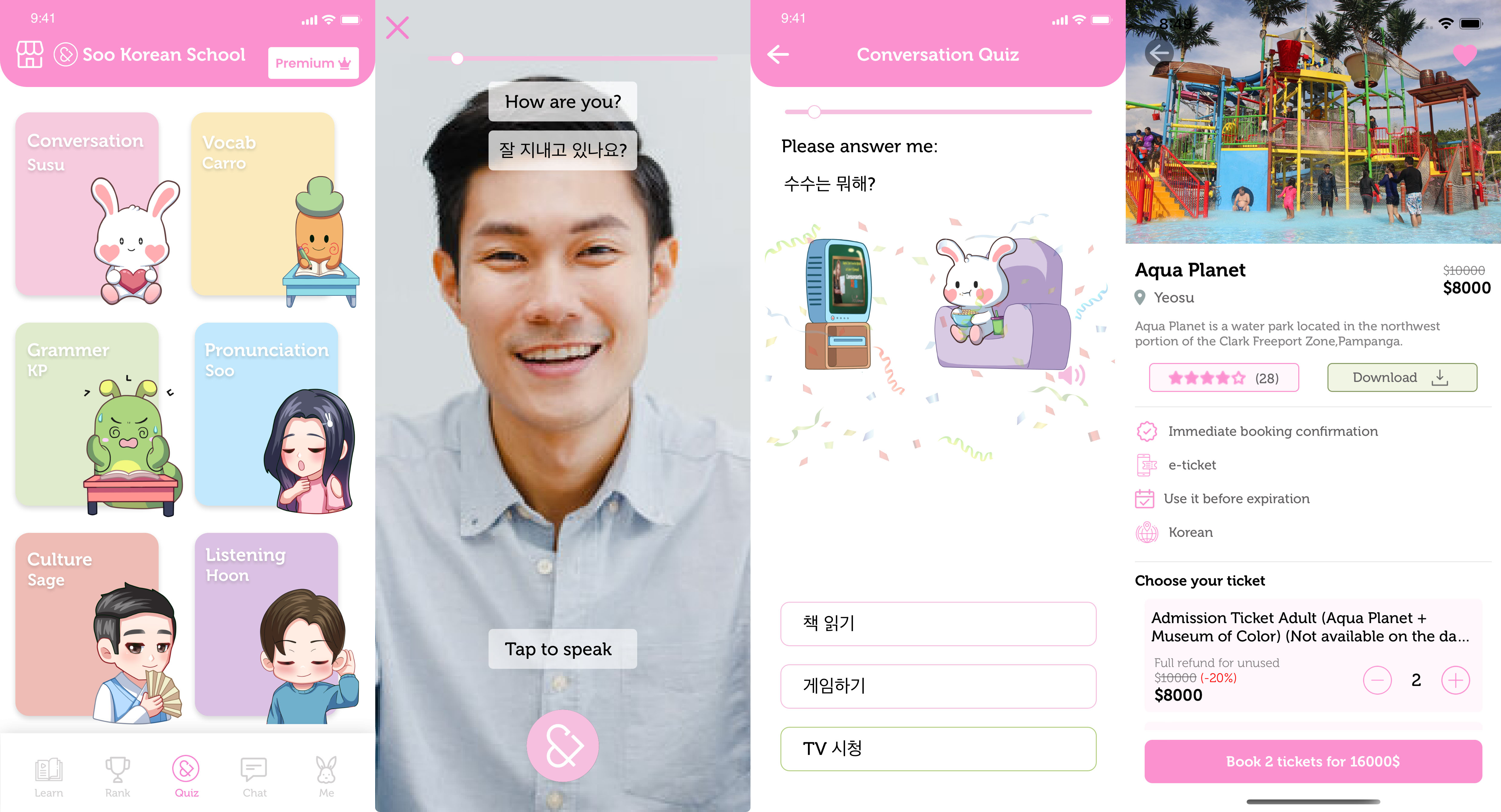 “현재 수앤캐롯츠에서 준비 중인 앱은 ‘Soo Korean’입니다. 초기에 서비스되는 내용은 회화 및 어휘, 문법, 그리고 문화와 발음 등으로 각 카테고리의 퀴즈와 한국어 수업을 제공하게 됩니다. STT(Speech To Text) 기술을 통해 한국어 발음을 교정하는 기능도 담고 있고요. 사용자는 앱을 통해 학습하고 활동하며 앱 내에서 활용할 수 있는 포인트를 얻게 되고, 이를 통해 캐릭터를 꾸미거나 채팅방을 만들어 다른 유저들과의 커뮤니티를 형성할 수도 있습니다. 이는 정기구독 형태로 국내의 다양한 오프라인 서비스 및 관광지와의 제휴를 통해 사용자들이 한국으로 여행 올 경우에도 할인 혜택을 받을 수 있도록 구성할 예정입니다. 나아가 안정적으로 유저 풀을 확보해 한국어 학습, 그리고 한국 문화에 관심이 많은 이들에게 한국 여행 상품을 소개하고 판매할 계획도 세우고 있어요. 이는 한국으로 여행 온 친한파(親韓派)들이 겪는 결제, 인증, 언어 등의 문제와 한국어 스터디, 동행 등의 편의를 하나의 앱으로 해결할 수 있는 최선의 수단을 제공해줌은 물론 그들에게 보다 즐거운 한국에서의 경험과 기억을 남겨드리고자 하는 선한 의도에서 시작된 프로젝트라 자신 있게 말씀드릴 수 있겠습니다”