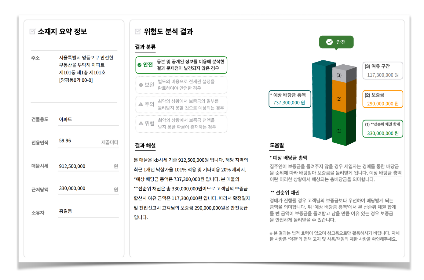 안전한부동산을부탁해 서비스는 부동산 거래에 익숙하지 않은 임차인들도 알아보기 쉬운 보고서를 제공해 전세 사기의 위험으로부터 스스로를 지킬 수 있는 힘을 기를 수 있도록 도움을 준다.