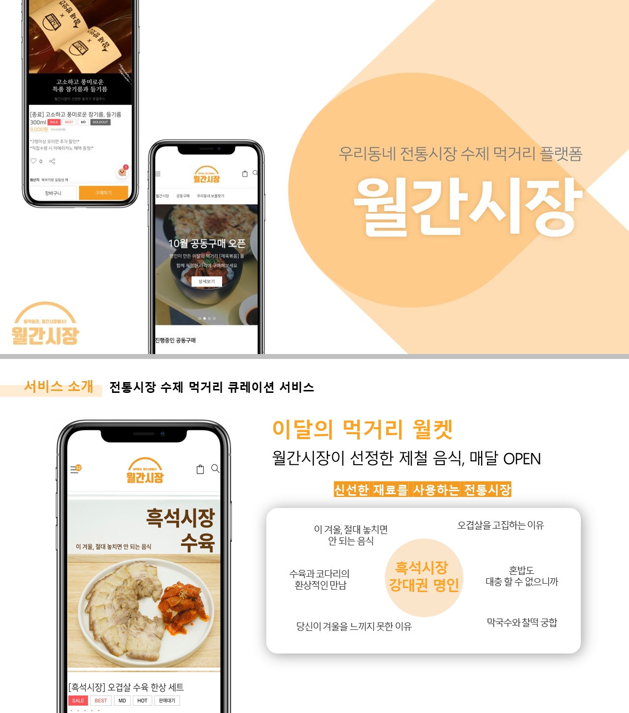 “동네 시장의 수제 먹거리를 젊은 감성으로 재조명하고 상품 경쟁력을 극대화하여 온라인으로 판매하고 있다. 진실한 마음으로 제품을 생산하고 고객과 소통하는 전통시장의 명인들을 자체 발굴해 제철 먹거리를 선정하고 있고, 소비자는 명인들이 만든 상품을 온라인으로 구매하면 월간시장 거점 협업 카페에서 상품을 수령하는 방식이다. 그동안 공동 구매와 라이브 커머스 판매를 거쳤고, 현재는 20대에게 전통시장의 매력을 알릴 수 있도록 1인 가구에 맞는 매력적인 제품들을 기획·판매하는 것을 목표로 하고 있다”