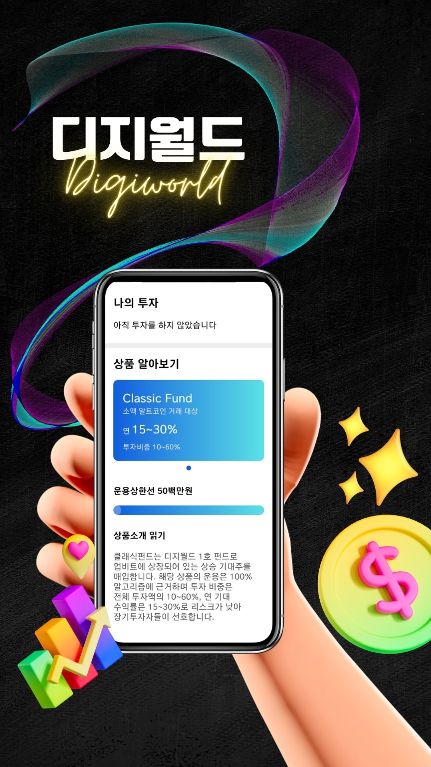 2023년 상반기 론칭을 앞두고 있는 디지월드는 이자가 은행보다 높고 소액으로도 투자가 가능하면서, 리스크는 낮고 정보가 투명한 AI형 펀드에 목돈을 맡길 수 있는 서비스다. 클립과의 연동을 통해 클레이튼 블록체인을 활용한 토큰으로 투자가 이루어지는 방식인데, 이용자는 돈을 맡기기 전 해당 AI의 상세 거래 이력과 상황 판단력을 스스로 확인할 수 있다는 장점이 있다. 박 대표는 “디지월드를 통해 잘 때도, 식사하면서도 자동으로 자산을 운용하여 이자를 받는 효율적인 경제 시스템을 개척하고 싶다”면서 “아직은 제한된 서비스로 기대보다 낮은 수익률을 발생시킬 수 있는 수준이지만 향후 수준 높은 B2C 금융 솔루션을 제공할 것이다”는 포부를 밝혔다.
