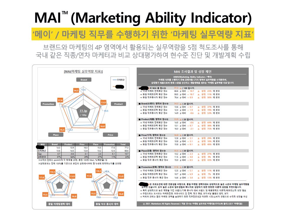 “그렇다. 이 방식이 중요한 이유는 전문적인 마케팅 인력을 뽑는데 어려움과 리스크가 있는 중소기업들의 부담을 덜어주는 것과 동시에 자생력을 키워줄 수 있어서다. 우리가 내부로 들어가 함께 ‘DNA’를 이식해주면 그 이후에는 스스로 운영할 힘이 생긴다. 이러한 관점에서 마케티움은 마케팅 담당자의 실무 역량을 측정하는 ‘메이(MAI, Marketing Ability Indicator)’라는 서비스를 함께 제공한다. ‘메이’는 정교한 설문을 통해 구축한 약 천여 명의 마케터들과 자신의 역량을 상대평가 할 수 있는 마케팅 실무 역량 지표로 특허출원을 준비 중이다. 이를 통해 마케팅 실무자의 현 수준을 진단하고 정확한 개발계획을 수립할 수 있게 되어 일회성으로 그치는 것이 아닌 성장의 기본 토대를 키울 수 있게 되는 것이다”