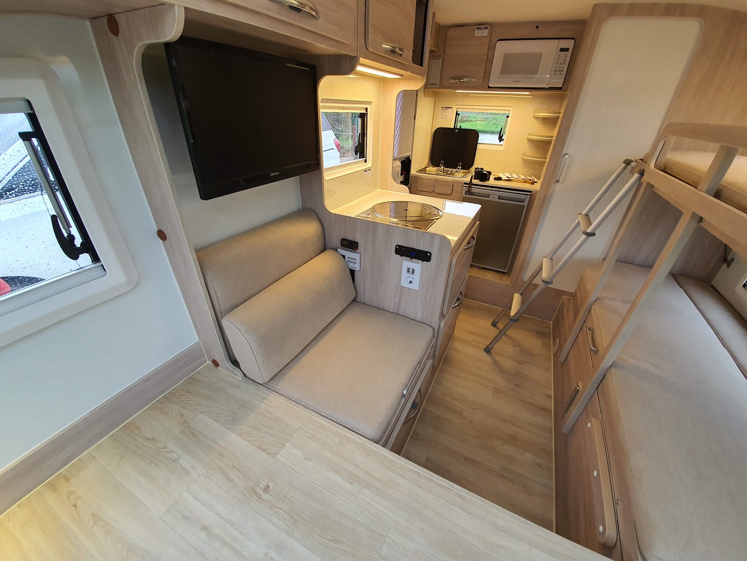 바이엘 패밀리는 단순한 시판 상품만으로 조립된 것이 아닌 네오오토 전용 부품으로 디자인과 품질을 모두 잡은 제품입니다. 최대 6명까지 이용 가능하지만 지하 주차장에 진입이 가능하며, 주차 1칸에 주차가 가능한 실용적인 사이즈로 제작되었습니다. ‘ㄷ’자 형태의 이용이 편리한 넓은 주방과 아이를 씻길 수 있는 수준의 욕실, 쇼파와 침대의 변환이 가능한 접이식 2층 침대를 갖추고 있습니다. 또한 실내를 가로막는 기둥을 최소화하고 대형 창문과 천장의 스카이라이트를 기본적으로 갖추고 있어 시원하고 넓은 실내 구조를 자랑합니다. 냉난방 시설은 겨울과 여름의 계절 차이가 명확한 한국의 기후적 특성에 맞게 천장형 에어컨과 바닥 온수난방이 가능한 경유보일러를 설치해 여름에는 시원하게, 겨울에는 따뜻하게 이용할 수 있도록 기획했습니다. 특히 바닥 난방은 복도뿐만 아니라 평상 위에도 적용하여 일반 가정집에서 지내는 것처럼 겨울을 보내실 수 있습니다.