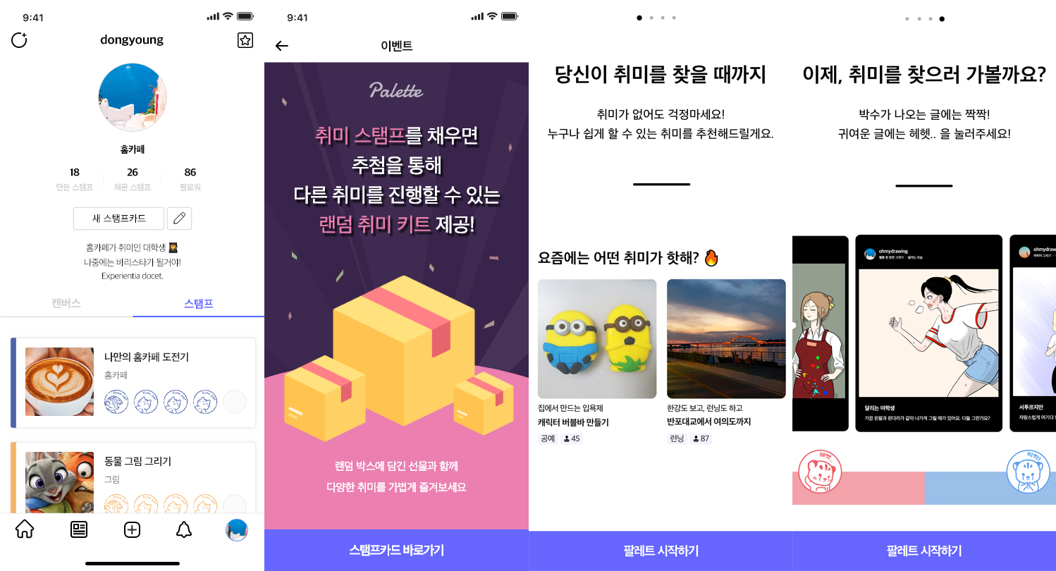 지난달 론칭한 ‘팔레트’는 1030을 위한 취미 커뮤니티 플랫폼으로서 ‘취미를 선물하는 앱 서비스’를 모토로 취미 정보를 이용자가 쉽게 접할 수 있도록 수집하고 콘텐츠화하는 서비스를 제공하고 있다.