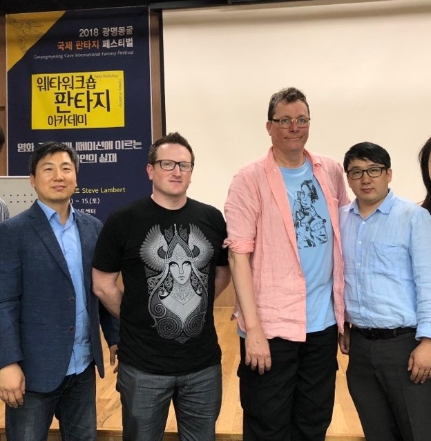 지삼백엔터테인먼트 주식회사는 2018년 부천국제판타스틱영화제의 광명 웨타워크숍 어워드 수상작인 ‘11+1’ 작품을 통해 SF/판타지 영상 산업을 주도하고 있는 웨타워크숍의 Richard Taylor 대표, Paul Tobin 수석디자이너(11+1 콘셉트 디자인 총괄)와 협업을 펼치며 업계 최고 수준의 기술력과 노하우를 장착하게 됐다. (좌측부터 안경민 콘텐츠개발이사, 웨타워크숍 관계자, Richard Talyor 웨타워크숍 대표, 하효경 대표)