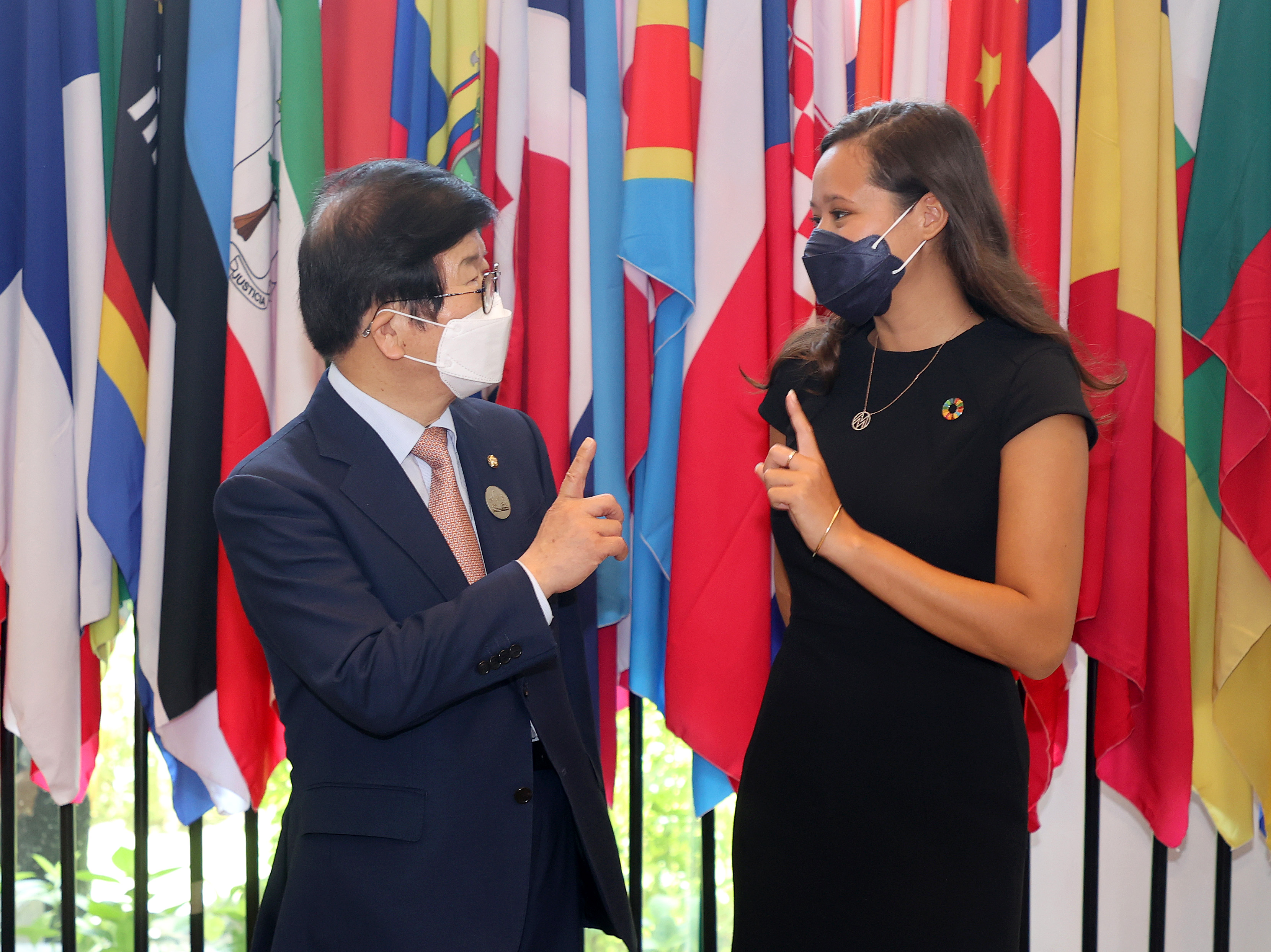 한편 박 의장은 발리의 청년 환경 운동가인 멜라티 위즌과 만나 플라스틱 추방 운동 등 환경의 중요성에 관해 의견을 나누기도 했다. 박 의장은 이날 총회 연설에서 플라스틱 추방의 시급성을 호소한 멜라티에게 “플라스틱병 하나가 썩으려면 500여 년이 걸린다. 어린 시절부터 이런 환경의 중요성을 알아야 한다”고 말했다. 멜라티는 이에 대해 “나는 지금 플라스틱을 추방하는 ‘바이바이플라스틱백(BBPB)’ 운동을 벌이고 있다. 서울에도 지부를 두고 있다”고 말했다.