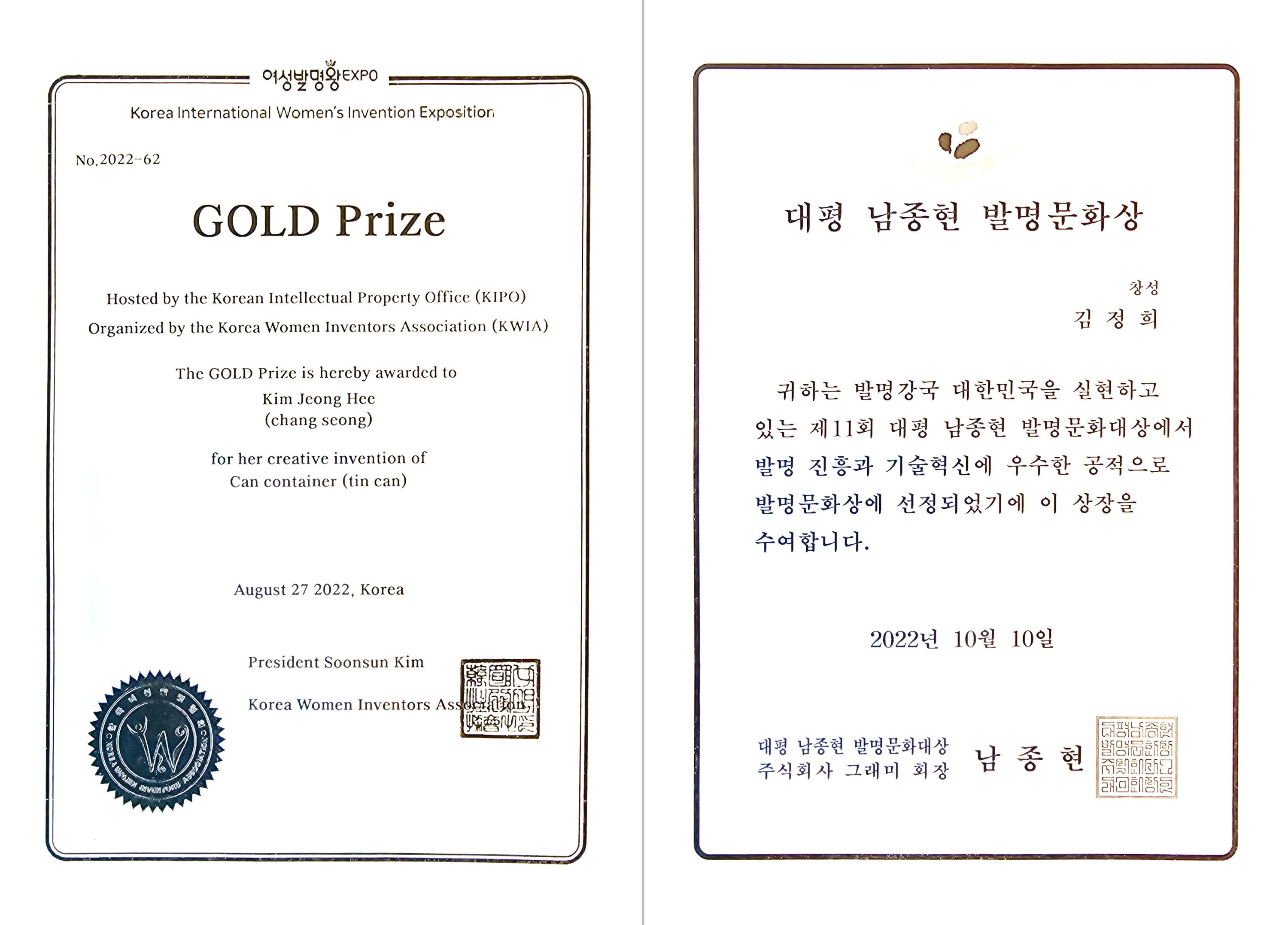 “그동안 스스로 느낀 불편함에서 출발해 좀 더 진보적이고 편리함을 추구하는 다양한 아이디어 개발을 위해 노력했다. 그 결과 2022년 여러 가지 유형의 각기 다른 내용물 보관이 가능한 ‘분할형 캔 용기’로 제15회 대한민국 세계여성발명대회 금상을 받았고, 패션 액세서리용 부츠 샤프트와 찾기 편리한 서랍형 캐리어로 은상을 수상했다. 또한 2022년 10월 제11회 대평 남종현 발명문화대상에서 발명문화상을 받은 바 있다”