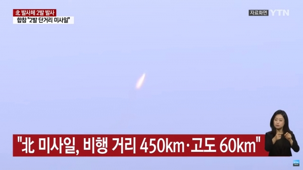합참은 “우리 군은 오늘 아침 7시6분경과 7시25분경 북한 함경남도 함주 일대에서 동해상으로 발사된 단거리미사일 2발을 포착했다”고 밝혔다. 미사일의 비행거리는 약 450㎞, 고도는 약 60㎞이며, 세부 제원은 한-미 정보당국이 정밀 분석중이다.